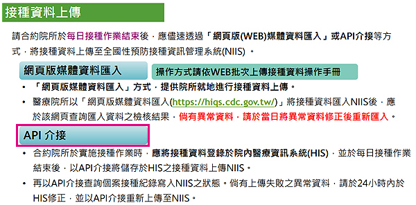 更版說明:依據衛生福利部疾病管制署疫苗接種紀錄應用程式介面(API)規格,新增建置診所資訊系統(HIS)與全國性預防接種資訊管理系統(NIIS)自動介接API 功能如下