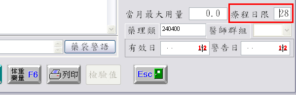 例如:於『4藥品資料』右下角「療程日限」欄位,有設定重複開立限提醒日限為「28」