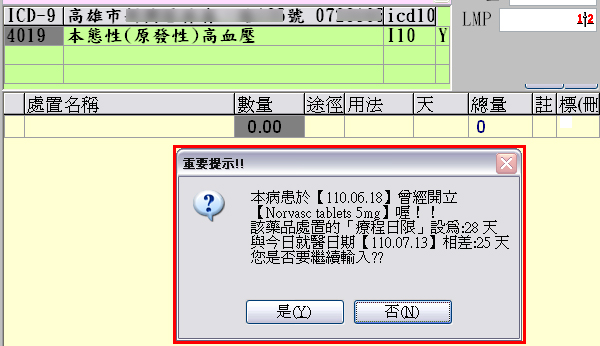 距離前次就醫開立未超過28日限,再次鍵入或ditto相同處置或用藥時,即會出現如下圖提醒