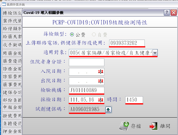 『核酸檢驗機構』、『採檢日期』、『試劑健保碼』完成後按下「存檔」即可