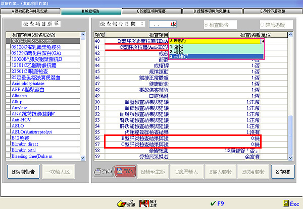 Q:醫聖診療系統內的成健報告登打欄BC肝檢查結果無法改點選為陰性或陽性