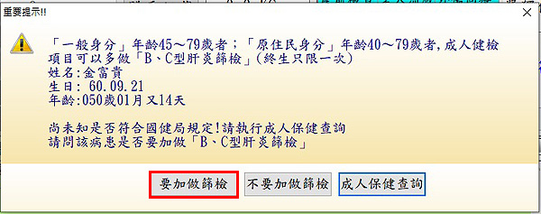 *確認有執行BC肝篩檢但未出現上述文字,重新執行F3掛號修編存檔,再點選『要加做篩檢』即可*