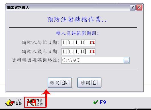 點選『預注上傳』如下圖示,指定轉出期間及轉出檔案置放路徑,再按下『確定』