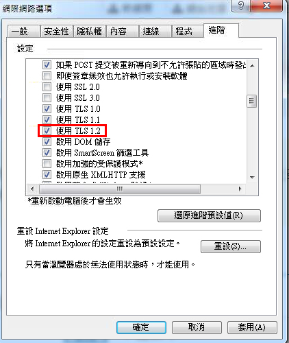 *用戶只要確認『使用 TLS 1.2 』有勾選即可!
