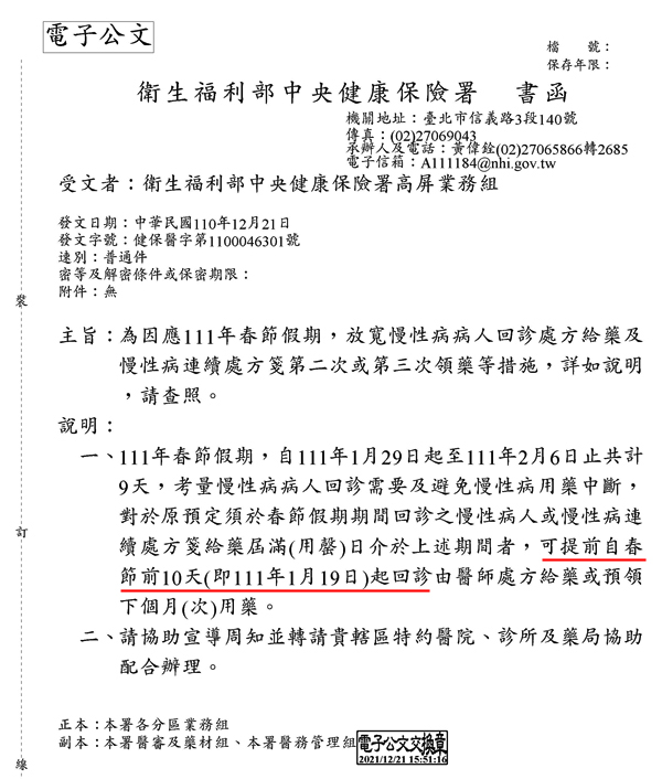 因應111年春節假期,放寬慢性病病人提前回診領藥等措施