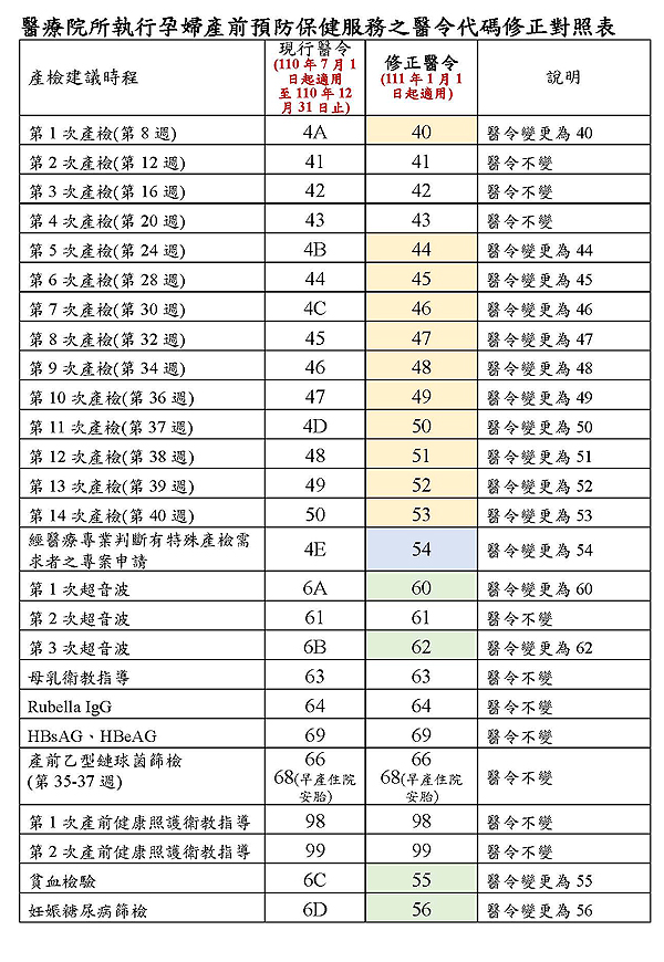 配合公告修正1月1日起重新調整產前檢查服務時程各項醫令代碼