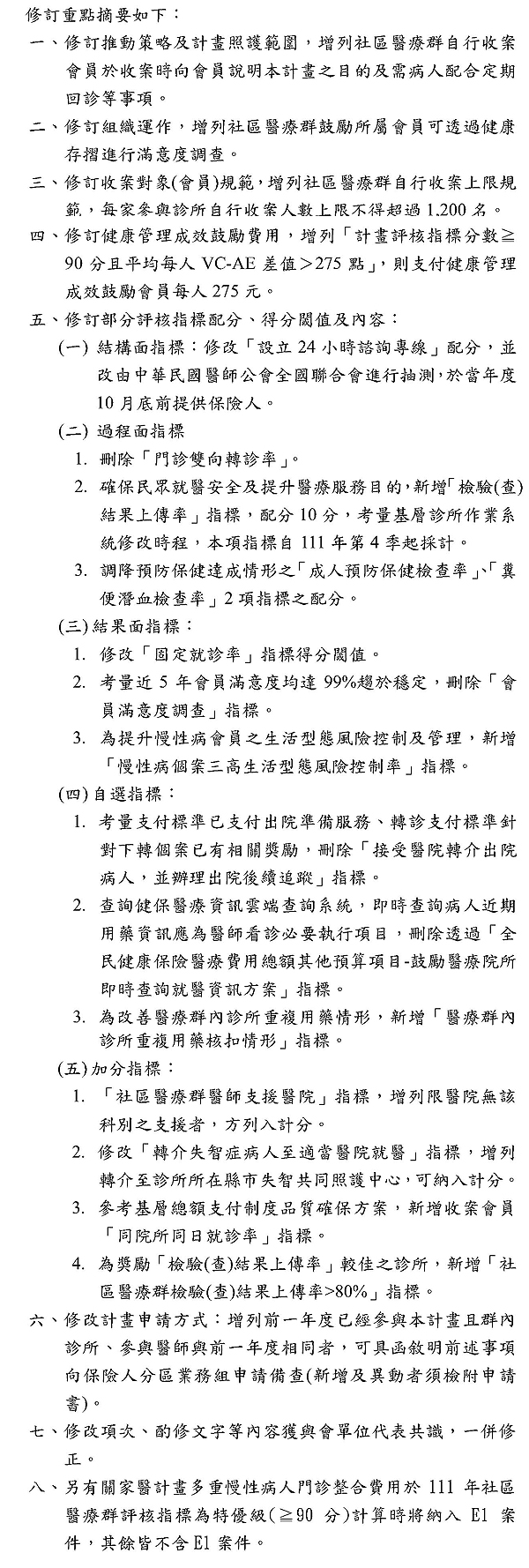 主旨:公告修正「全民健康保險家庭醫師整合性照護計畫」,如附件,並自111年1月1日起實施。
