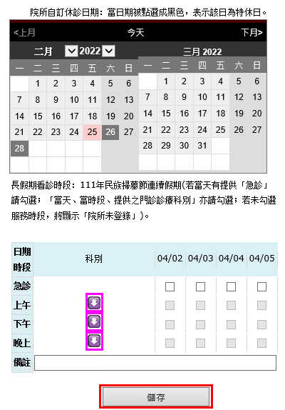 ↑↑↑ 用滑鼠左鍵點選向下鍵(粉框處)即可展開科別時段勾選項目 ↓↓↓