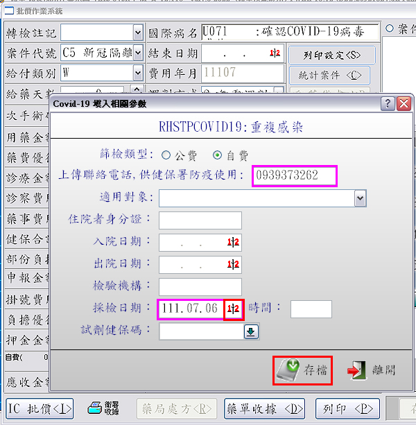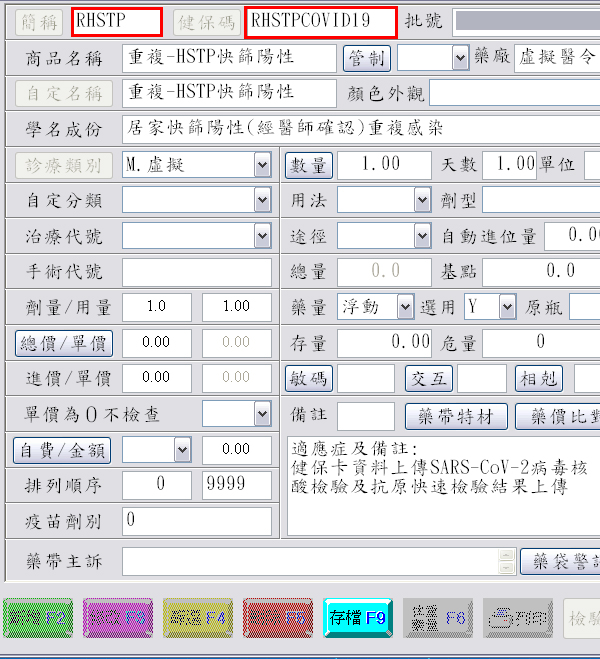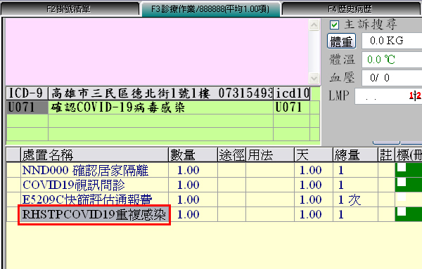 批價作業:顯示『RHSTPCOVID19:重複感染』快篩陽性登打畫面