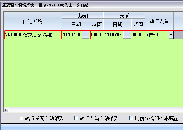 診療作業:於『F3診療作業』畫面,系統會自動帶入虛擬醫令代碼『NND000』