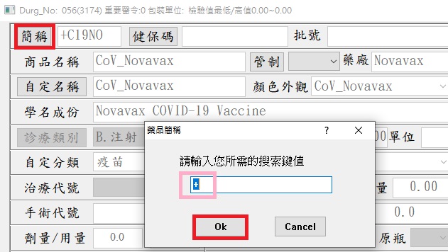 於『4藥品資料』按下『簡稱』輸入『+』再按下『Ok』可搜尋COVID-19疫苗使用代碼品項