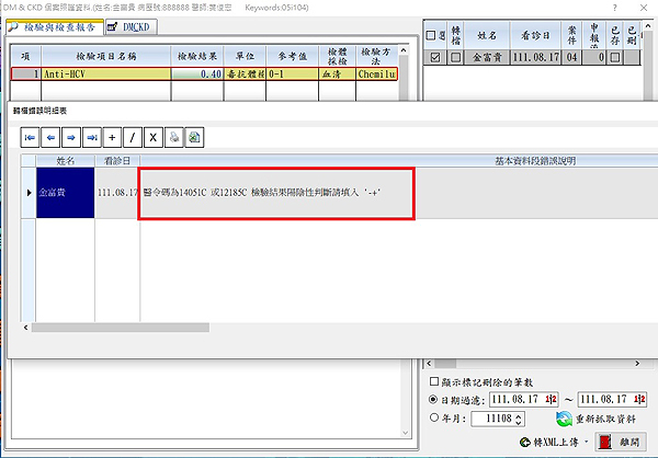 根據公告診療項目代碼14051C(C型肝炎病毒抗體檢查)及12185C(核糖核酸類定量擴增試驗)結果值疑義