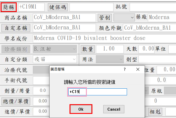 於『4藥品資料』按下『簡稱』輸入『+C19』再按下『Ok』可搜尋COVID-19疫苗相關品項