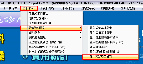 於醫聖主畫面點選系統工具列「D 資料庫>醫令資料匯入>匯入NIIS疫苗資料」