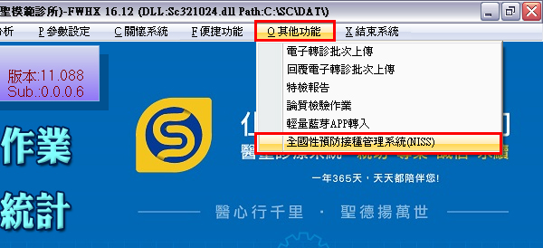 操作說明: 於醫聖多功能選項表「O 其他功能 > 全國性預防接種管理系統(NISS)」項目進入