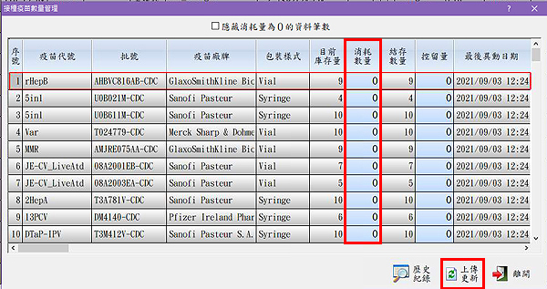 於「消耗數量」欄輸入當日用量,再點選「上傳更新」即可更新回報各類疫苗注射量