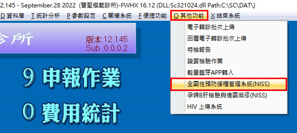 操作說明: 於醫聖多功能選項表「O 其他功能 > 全國性預防接種管理系統(NISS)」項目進入