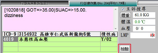 一、於診斷病名ICd9的畫面右方多一個功能按鈕『檢驗』,可將畫面切換至『B 檢查報告』上。