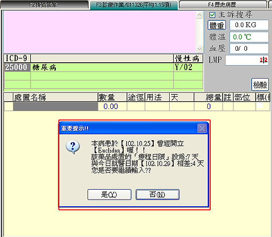 於藥品資料內針對特定藥品或處置只要有設定「療程日限」,當醫師開到該藥品或處置時,會用今天的就醫日期與上次開立的就醫日期做比對,檢查是否已經大於院所設定的「療程日限」,如果大於院所設定可使用日限,就要提醒醫師是否要繼續存檔批價(如下圖)。