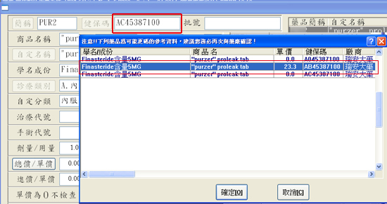 二、於要改碼的藥品資料編輯畫面內,將滑鼠游標置放於「健保碼」欄位內,再按下『CTRL』鍵不放,再按『F11』鍵,便會自動搜尋相近健保碼資料供選擇快速修改。
