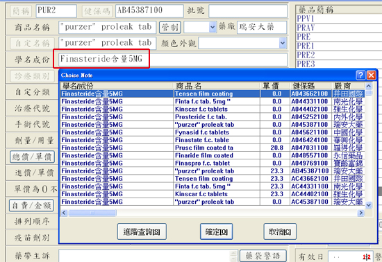 於該藥品資料編輯畫面內,將滑鼠游標置放於「學名成份」欄位內,再按下『F11』鍵,便會自動搜尋相關的藥品資料供使用者參閱。