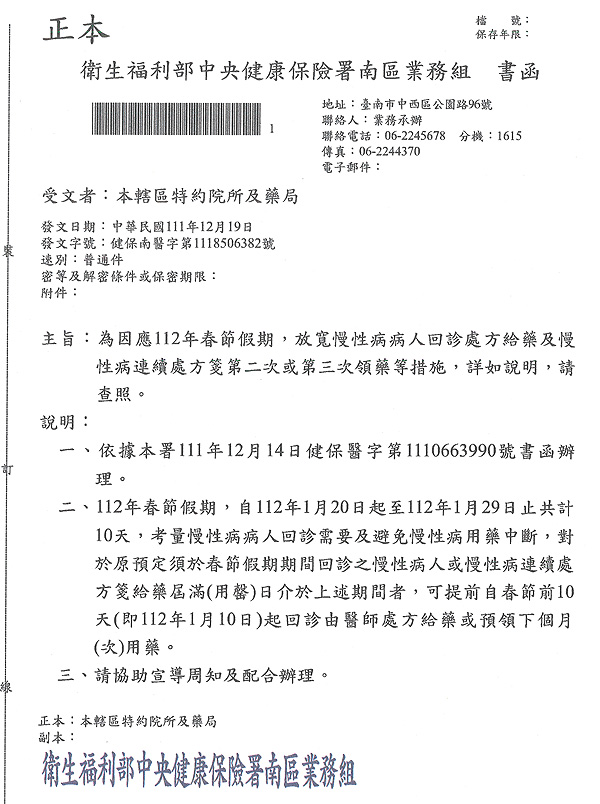 因應112年春節假期,放寬慢性病病人提前回診處方給藥及慢箋領藥等措施