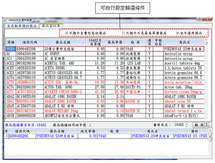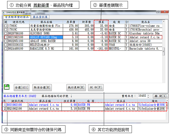 功能分頁-『有異動單價的藥品』重點說明: