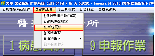 或於醫聖主機系統主選單畫面上方的多功能選單,點選「S 系統工具」「M 系統更新」 |