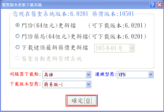 | 步驟二:會出現如下圖畫面,用滑鼠點選「門診(64位元)更新檔」,再按下「確定」 |