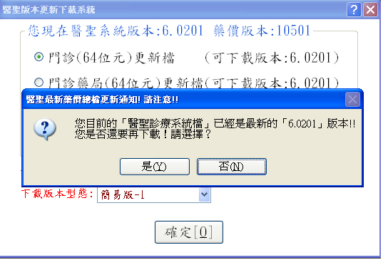 | 若您目前使用的醫聖系統已是最新版本會出現如下圖畫面,若需要再重新下載更新請按下「是」,若不需要則按下「否」離開即可 |