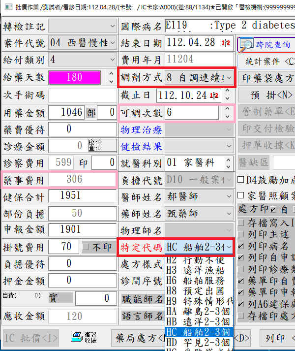 2. 批價畫面 (務必照以下軟體操作順序):『調劑方式』點選「8.自調連續處方」或「7.交調連續處方」