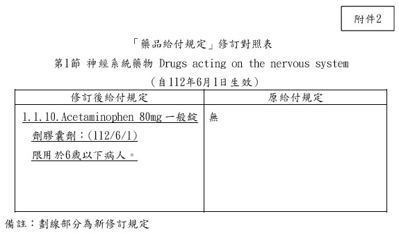 二、修訂「全民健康保險藥物給付項目及支付標準-第六編第八十三條之藥品給付規定第1節神經系統藥物 1.1.10.Acetaminophen 80mg一般錠劑膠囊劑」部分規定,給付規定修訂對照表如附件2。(附件電子檔已置於本署全球資訊網(https://www.nhi.gov.tw),路徑為:首頁>健保法令>最新全民健保法規公告,請自行下載)