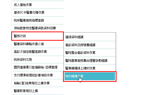 服務項目:點選「醫務行政」再點選「特約機構作業