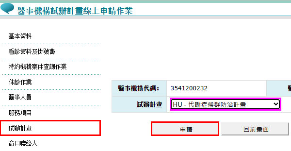 步驟三、點選欲申請試辦計畫項目『HU-代謝症候群防治計畫』後,再點選「申請