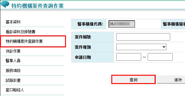 服務項目:點選「醫務行政>特約機構作業特約機構案件查詢作業」,接著再 點選「查詢
