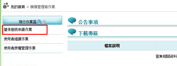 步驟一、服務項目:點選「機構管理作業」>「健保服務申請作業