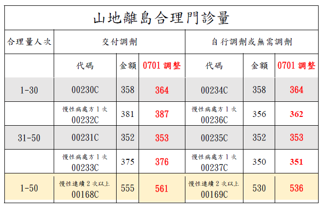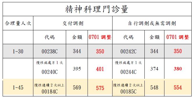 1. 基層院所門診診察費第一段門診量(1~30人次)支付點數調升六點(含精神科),其餘項目調升一點。