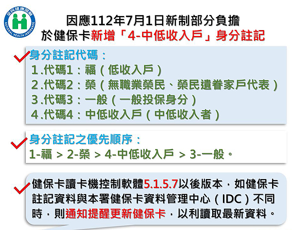 為因應112年7月1日新制部分負擔,於健保卡新增「4-中低收入戶」身分註記。
