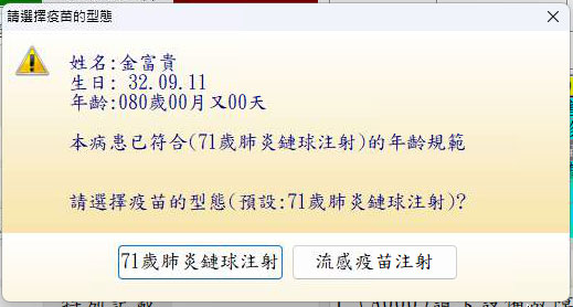 1. 若接種對象實際年齡>=71時,按『F9 存檔』會出現如下圖示,詢問當次執行項目