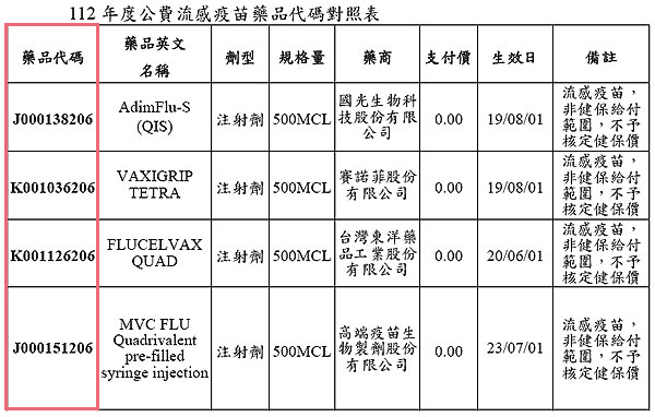 ● 本年度接種流感疫苗品項公告針劑健保碼 [新增高端四價]