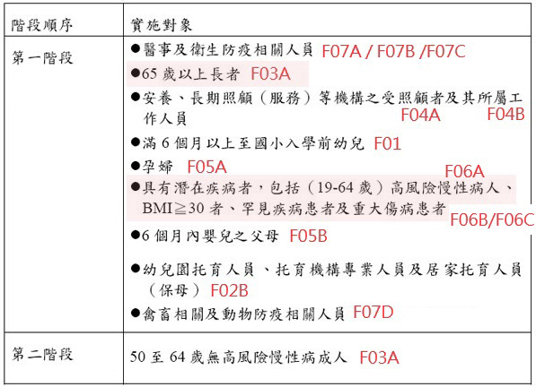 流感疫苗接種計畫各類實施對象需具中華民國國民身分,並符合下列條件者: