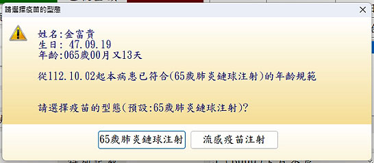 就醫日期為112.10.02以後且掛號對象符合65歲以上條件存檔時,會出現如下圖視窗