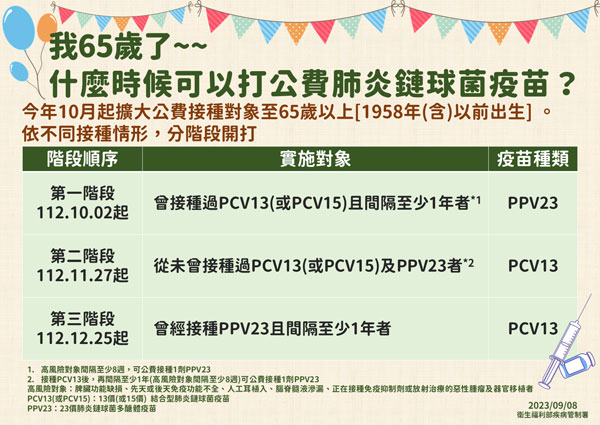 更版功能: 配合公告「65歲以上長者肺炎鏈球菌疫苗」接種補助計畫下修掛號年齡