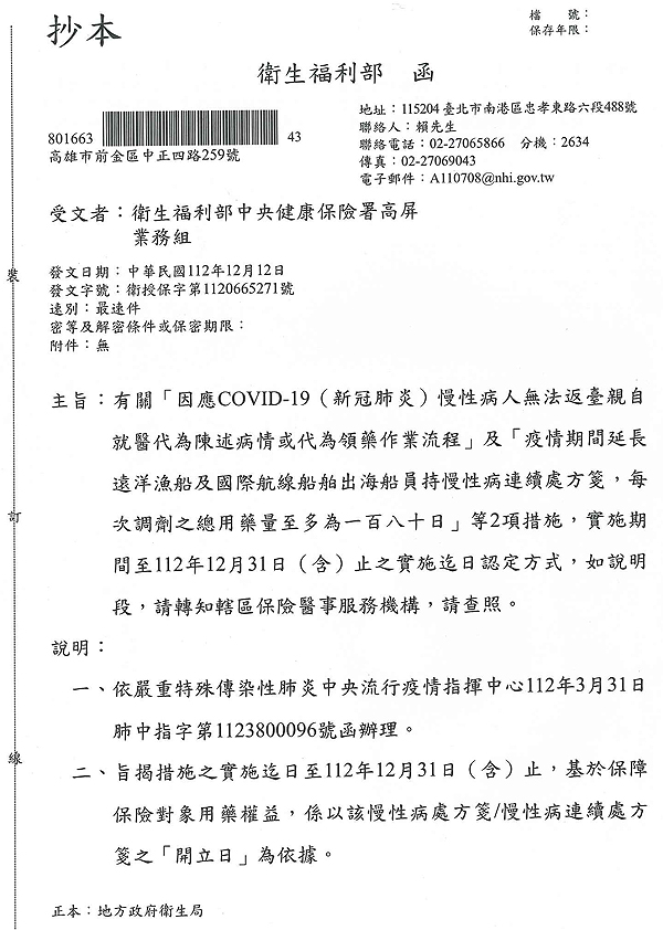 有關因應COVID-19慢性病人領藥措施,實施期間至112年12月31日(含)止之實施迄日認定方式