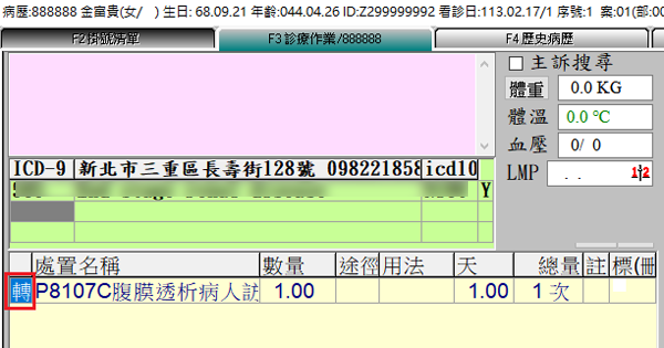 診療作業:處置輸入「P8107C」或「P8108C」時,前方註記填「轉」