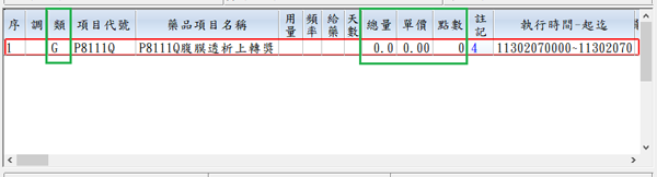 「醫令類別」填「G(專案支付參考數值)」,「總量」、「單價」、「點數」填 0。