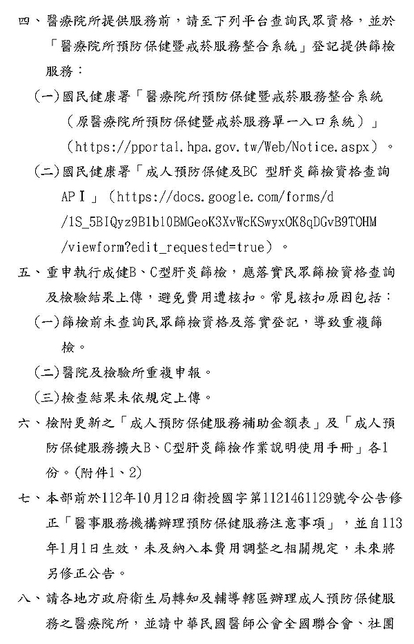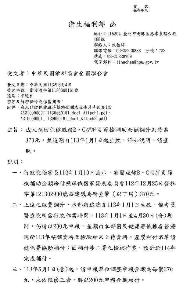 成人預防保健服務B、C型肝炎篩檢補助金額調升為每案370元,並追溯自113年1月1日起生效,詳如說明
