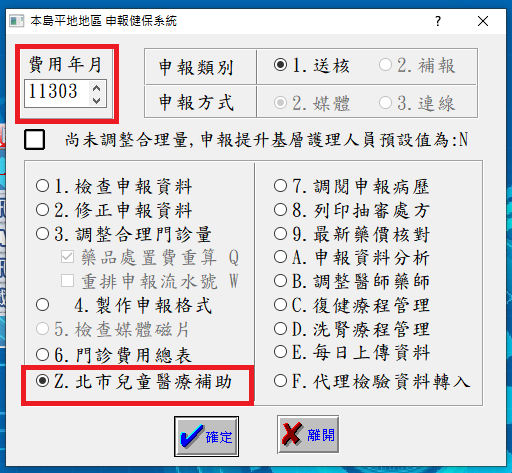 於『9申報作業』->選擇要列印或轉檔的『費用年月』->點選『Z.北市兒童醫療補助』->按下『確定』