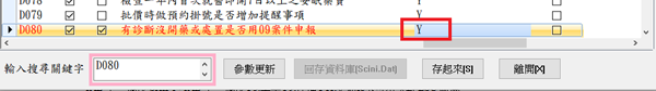 於上方點選參數標籤「PRICE [D]」於下方尋找編號D080「有診斷沒開藥或處置是否用09案件申報」