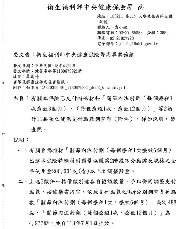 有關支付特殊材料關節內注射劑等2類計11品項之健保支付點數調整